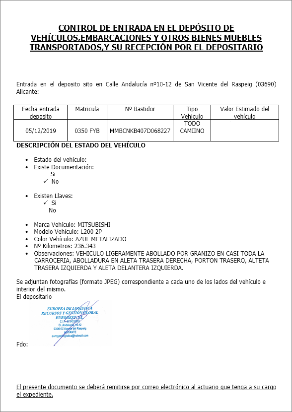 Tiene llaves pero no tiene documentación. El vehículo está ligeramente abollado por granizo en casi toda la carrocería, hay abolladuras en aleta trasera derecha, portón trasero, aleta trasera izquierda y aleta delantera izquierda. El depositario es EUROPEA DE LOGÍSTICA RECURSOS Y GESTIÓN GLOBAL EUROGEST, SL y está situado en la C/ Andalucía nº 10-12 de San Vicente del Raspeig, Alicante (teléfono 63699904-966635280 y correo electrónico eurogest eurogest.es - mariano eurogest.es).