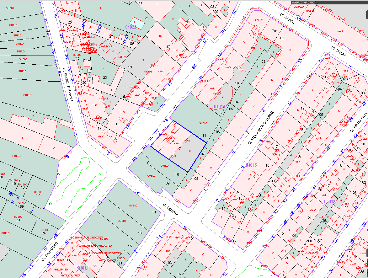 URBANA: F NCA NUMERO DOCE.- PLENO DOMINIO PLAZA DE GARAJE NUMERO TRES. SE ENCUENTRA SITUADA EN LA PLANTA DE SÓTANO 1 O SEGUNDA DE CONSTRUCCIÓN DEL EDIFICIO DENOMINADO PARQUE DE LA DIRECCIÓN LLL , SITO EN MADRID, EN LA CALLE CANTUESO, NÚMERO 70. TIENE UNA SUPERFICIE CONSTRUIDA APROXIMADA DE 23,39 METROS CUADRADOS, INCLUIDOS ELEMENTOS COMUNES, ZONAS DE MANIOBRA Y ACCESOS. LINDA: AL FRENTE, CON PASILLO DE DISTRIBUCIÓN Y CIRCULACIÓN DERECHA, CON PLAZA DE GARAJE NÚMERO 4 IZQUIERDA, CON PLAZA DE GARAJE NÚMERO 2 Y POR EL FONDO, CON SUBSUELO DE LA FINCA MATRIZ.