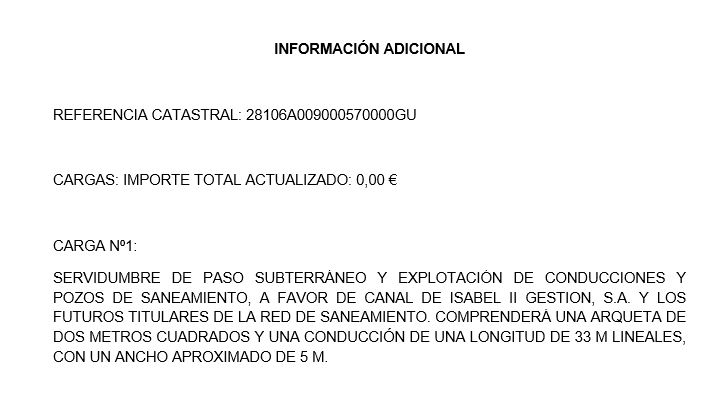 - Cargas que afectan al bien: existe más información en imágenes-anexo. - Informe de valoración: Ref. catastral: 28106A009000570000GU, Parcela 57 del polígono 9 con una superficie de 11.806m2. Registralmente, se trata de dos fincas, la finca nº20.901 que dispone de una superficie de 5.136 m2 y la finca nº14.738 con una superficie de 5.136 m2, por lo que la superficie total sumando las dos fincas registrales, es de 10.272 m2. Para la valoración se adopta la superficie catastral, como suelo no urbanizable.