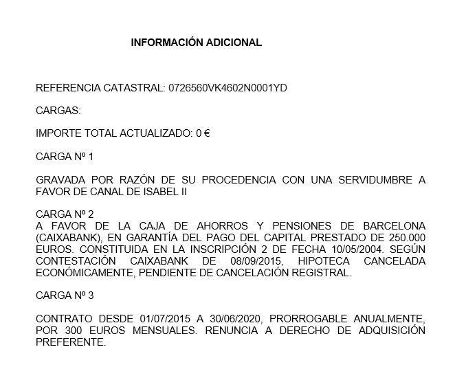 Discrepancia Registro (528 m2) y Catastro (599 m2). Servidumbre a favor del Canal de Isabel II. Contrato arrendamiento desde 01/07/2015 a 30/06/2020, prorrogable anualmente, con renuncia al derecho de tanteo. Renta de 300 euros mensuales. Derecho de retracto. CARGAS QUE AFECTAN AL BIEN: EXISTE MÁS INFORMACIÓN EN IMÁGENES & 8211 ANEXO CARGAS.