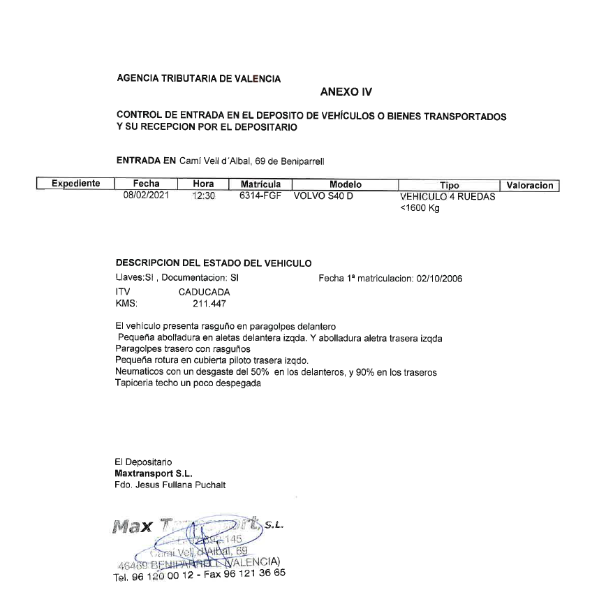 Tiene llaves y documentación. Fecha 1ª matriculación: 02/10/2006 ITV Caducada Kms: 211.447 El vehículo presenta rasguños en paragolpes delantero. Pequeña abolladura en aletas delantera izquierda y abolladura aleta trasera izquierda. Paragolpes trasero con rasguños, pequeña rotura en cubierta piloto trasera izquierdo. Neumaticosa con un desgaste del 50% en los delanteros y 90% en los traseros. Tapiceria techo un poco despegada. Depositario: MAXTRANSPORT. Localización: Camí Vell d'Albal, Nº 69 46469, Beniparrell (Valencia). Teléfono:961200012.