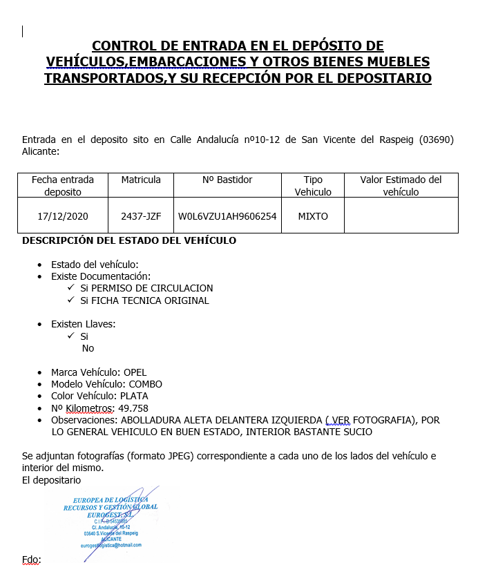 Tiene llaves y documentación. Fecha matriculación: 23/05/2017 Fecha caducidad ITV: 21/05/2022 Kilometros: 49.758 El vehículo presenta abolladura en la aleta delantera izquierda. El estado del vehículo, en general, es bueno. El interior del vehículo está sucio. El depositario es EUROPEA DE LOGÍSTICA RECURSOS Y GESTIÓN GLOBAL EUROGEST, SL y el lugar del depósito es en la C/ Andalucía nº 10-12 de San Vicente del Raspeig, Alicante (teléfono 966635280 y correo electrónico eurogest eurogest.es - mariano eurogest.es).