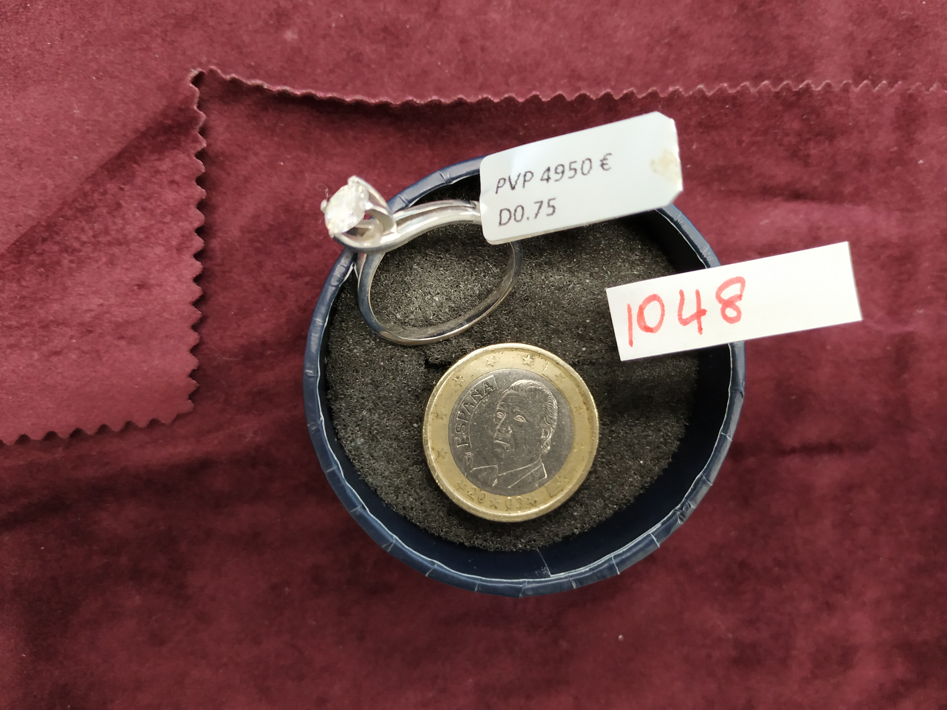 ANILLO DE ORO BLANCO 750/000, MODELO SOLITARIO CON LAS GARRAS CRUZADAS, Y EN EL CENTRO UN DIAMANTE TALLA BRILLANTE DE 5,60 MM Y 0,75 CTS. PESO 4 GRS. FOTO 1048.