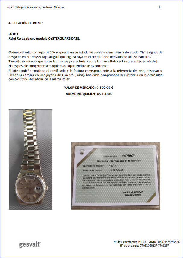 Reloj de oro modelo QYSTERQUARZ-DATE (valor de mercado 9.500,00€). Han sido valorados por la empresa GESVALT. Se anexan fotos con el informe de valoración. Depositado en la oficina de la Delegación de la AEAT en Alicante, avenida Aguilera nº 20.