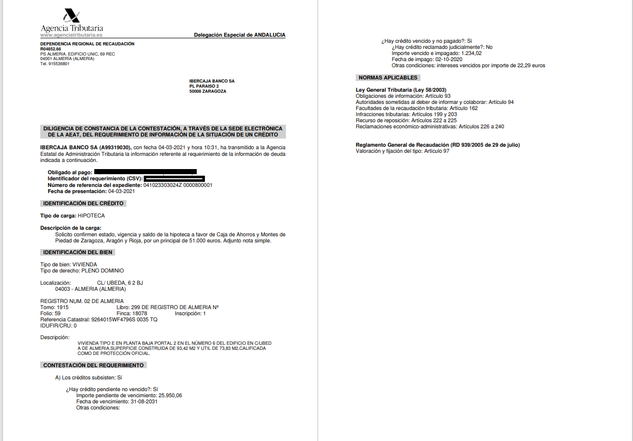 - Realizada la visita al inmueble en fecha 16-04-2021 no ha podido comprobarse la ocupación de la finca. - Cargas preferentes: a) Hipoteca a favor de Caja de Ahorros y Monte de Piedad de Zaragoza, Aragón y Rioja (inscripción 1ª), con importe pendiente conforme información proporcionada por la entidad financiera a 04-03-2021 de 27.206,37 euros. El adjudicatario deberá hacer frente a los intereses que se devenguen y que se encuentren pendientes. b) VPO. Ver documento anexo. - Existen discrepancias entre la información registral y catastral.