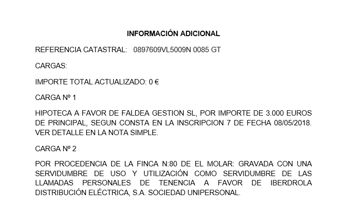 Discrepancia superficie registral y catastral: Registro: 10,35 m2 Catastro: 10m2 Discrepancia dirección: Registro: PLAZA PARAISO, número 56, planta: SOT 2, plaza de garaje: 24 Catastro: AV ESPAÑA 56 Pl:-2 Pt:24, 28710 EL MOLAR MADRID SE DESCONOCEN LOS MOTIVOS DE LA DISCREPANCIA RC: 0897609VL5009N0085GT. CARGAS QUE AFECTAN AL BIEN: EXISTE MÁS INFORMACIÓN EN IMÁGENES & 8211 ANEXO.