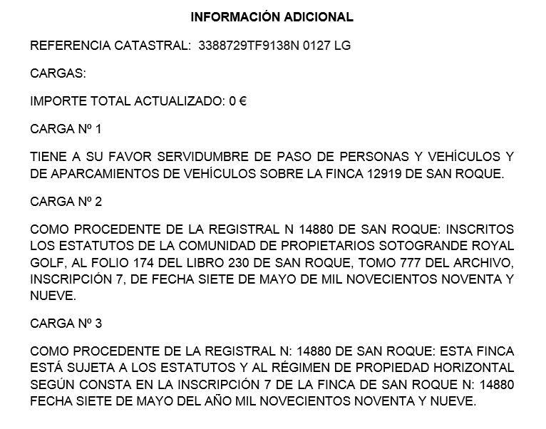100% PLENO DOMINIO. URBANA: 127.GARAJE SEÑALADO CON EL NUMERO B13 SITUADO EN LA PLANTA BAJA DEL EDIFICIO APARTAMENTOS SOTOGRANDE ROYAL GOLF EN LA URBANIZ. DE SOTOGRANDE, DEL TERMINO MUNICIPAL DE SAN ROQUE. SUPERFICIE TOTAL CONSTRUIDA, INCLUIDA LA PARTE PROPORCIONAL EN ELEMENTOS COMUNES DE 24 M2. LINDANDO POR SU FRENTE, CON ZONA DE RODADURA POR LA DCHA ENTRANDO, CON EL GARAJE NUMERO SIGUIENTE AL PRESENTE IZDA, CON EL GARAJE NUMERO ANTERIOR AL PRESENTE Y FONDO, CON MURO DE CERRAMIENTO Y CON LA FINCA NUMERO 111 DEL EDIFICIO. CUOTA: 0,169%.TIENE A SU FAVOR SERVIDUMBRE DE PASO DE PERSONAS Y VEHICULOS Y DE APARCAMIENTOS DE VEHICULOS SOBRE LA FINCA 12919. REF CAT: 3388729TF9138N0127LG.