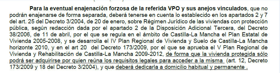 Para la enajenación forzosa de la VPO y sus anejos vinculados, que no podrán enajenarse de forma separada, sólo podrá ser adquirirse por quien reúna los requisitos legales para acceder a la misma (art. 12, Decreto 173/2009 y 18 del Decreto 3/2004), y que deberá dedicarla a domicilio habitual y permanente. Más información en imagen anexa. CARGAS QUE AFECTAN AL BIEN: EXISTE MÁS INFORMACIÓN EN IMÁGENES & 8211 ANEXO CARGAS.