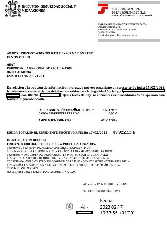 - Se enajena 1/3 del pleno dominio. - Cargas preferentes: 1. Embargo a favor de la Tesorería General de la Seguridad Social por un importe de 3.514,94 €, anotado en letra A de fecha 20/02/2018. Cancelado económicamente según contestación de la Tesorería General de la Seguridad Social de fecha 17/02/2023, que se anexa como imagen. Pendiente de cancelación registral. - Realizada la visita al inmueble en fecha 06/05/2022 no ha podido comprobarse la ocupación de la finca. - Existe construcción que no consta inscrita en el Registro de la Propiedad. - Existe discrepancias entre la información registral y catastral.