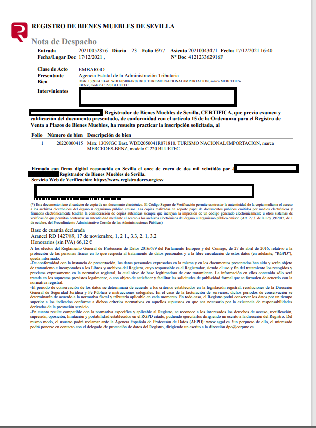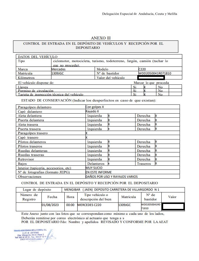 - Depositario: Trans-asistencia de La Chica SL. Ctra. Villagordo, km 0, 1 Nave 3 Mengibar (23520) Jaén. - Tlf. cita previa: 953 372 233 - Datos comunicados por el depositario: 250.922 km., consta documentación y llave. - Última ITV disponible en la DGT: Favorable en fecha 28/07/2023 (03/08/2025). - El adjudicatario asumirá los costes de depósito del vehículo a partir del 3º día de habérsele notificado la Certificación del Acta de adjudicación. - Serán por cuenta del adjudicatario los gastos e impuestos exigidos por el artículo 99.2 del Real Decreto Legislativo 2/2004, de 5 de marzo, por el que se aprueba el Texto Refundido de la Ley Reguladora de las Haciendas Locales, para la tramitación del expediente de transferencia ante la Jefatura Provincial de Tráfico. - En relación con la tramitación del vehículo son de aplicación los artículos 32 y 33 del Real Decreto 2822/1998, de 23 de diciembre, por el que se aprueba el Reglamento General de Vehículos.
