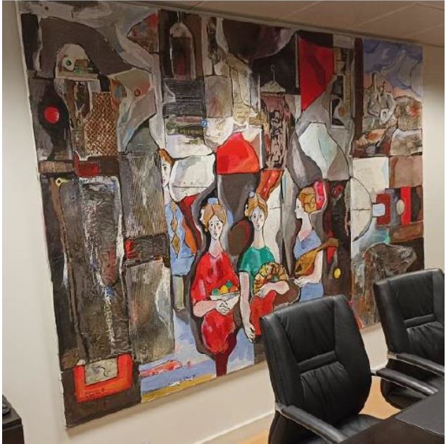 PINTURA CON TÉCNICA MIXTA SOBRE LIENZO FIRMADA POR MIGUEL TERNER DE SEMIR, CON IMAGEN DE TRES MUJERES. DIMENSIONES: ALTO 200 CM. Y ANCHO 300 CM. ESTADO: BUENO.