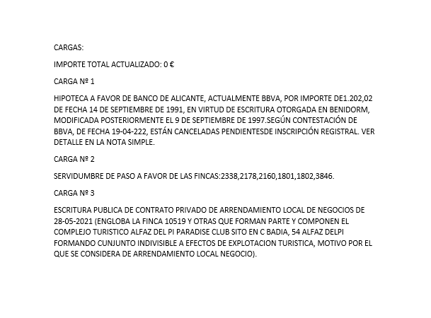 Datos Catastro: Clase: urbano, Uso principal: ocio, hostelería, Superficie construida 25 m2 (aparcamiento 25m2). Superficie según Registro 10,12 m2. La valoración efectuada no contempla las posibles minusvalías y/o plusvalías que pueda tener el derecho como consecuencia de cargas o circunstancias que pesen sobre él no tenidas en cuenta en la presente valoración, como arrendamientos, servidumbres, contratos a respetar, hipotecas u otros. CARGAS QUE AFECTAN AL BIEN: EXISTE MÁS INFORMACIÓN EN IMÁGENES & 8211 ANEXO.