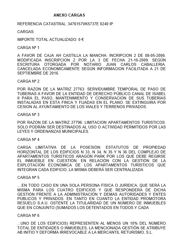 APARTAMENTO TURISTICO PL 4 PTA 9. SITUADO EN LA PL 4 DEL EDIFICIO 34, SOBRE LA PARCELA 34 DEL ESTUDIO DE DETALLE AVDA DE ARAGÓN, 402 DE MADRID, Y TIENE SU ENTRADA POR EL PASILLO-DISTRIBUIDOR DE ESTA PLANTA. OCUPA UNA SUP CONSTRUIDA TOTAL DE 201,17M2 APROX, DE LOS QUE 63,48M2 APROX CORRESPONDEN A ELEM. COMUNES Y 28,62M2 APROX CORRES. A CUBIERTA DE PLANTA INFERIOR QUE LE ES ATRIBUIDA A ESTE APARTAMENTO COMO TERRAZA DE USO PRIVATIVO. CONSTA DE VARIAS DEPENDENCIAS Y SERVICIOS, FORMANDO PARTE DE ÉL UN BALCÓN SOBRE PLANTA INFERIOR. SU COEF GRAL RESPECTO AL TOTAL EDIFICI DEL QUE FORMA PARTE ES DE 3,4015%. ACTUALMENTE: CL MANUEL VAZQUEZ MONTALBAN 3 ES:34 PL:04 PT:09 28022 MADRID. SE EJECUTA LA ANOTACION D A FAVOR DE LA AEAT PRORROG POR LA E,FY G