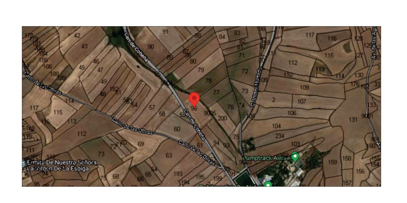 DATOS FINCA: MUNICIPIO: AJALVIR.FINCA Nº: 659 CÓDIGO REGISTRAL ÚNICO: 28149000203991. NATURALEZA DE LA FINCA: RÚSTICA. LUGAR CAMINO DE COBEÑA C.P.28664. POLÍGONO 5 , NÚMERO 6.- TIERRA EN AJALVIR, EN LA ROTURA VIEJA DEL MONTE, A LA IZQUIERDA DEL CAMINO VIEJO DE COBEÑA, DE SUPERFICIE UNA HECTÁREA, DOS ÁREAS, SESENTA Y NUEVE CENTIÁREAS EQUIVALENTE A 10.269 METROS CUADRADOS. LINDA AL NORTE: HEREDEROS DE MARCELIANO GALLEGO. SUR: TIERRAS DE JACINTO ACERO Y FRANCISCO HERNANZ. OESTE: ANTONIO GALLEGO Y ESTE: CAMINO DE COBEÑA. DATOS CATASTRALES: C/POLÍGONO 3 PARCELA 96 COBEÑA. AJALVIR MADRID . REFERENCIA CATASTRAL: 28002A003000960000PX.