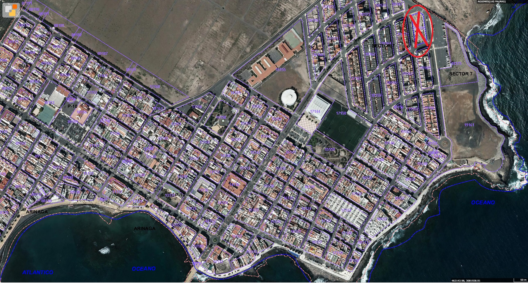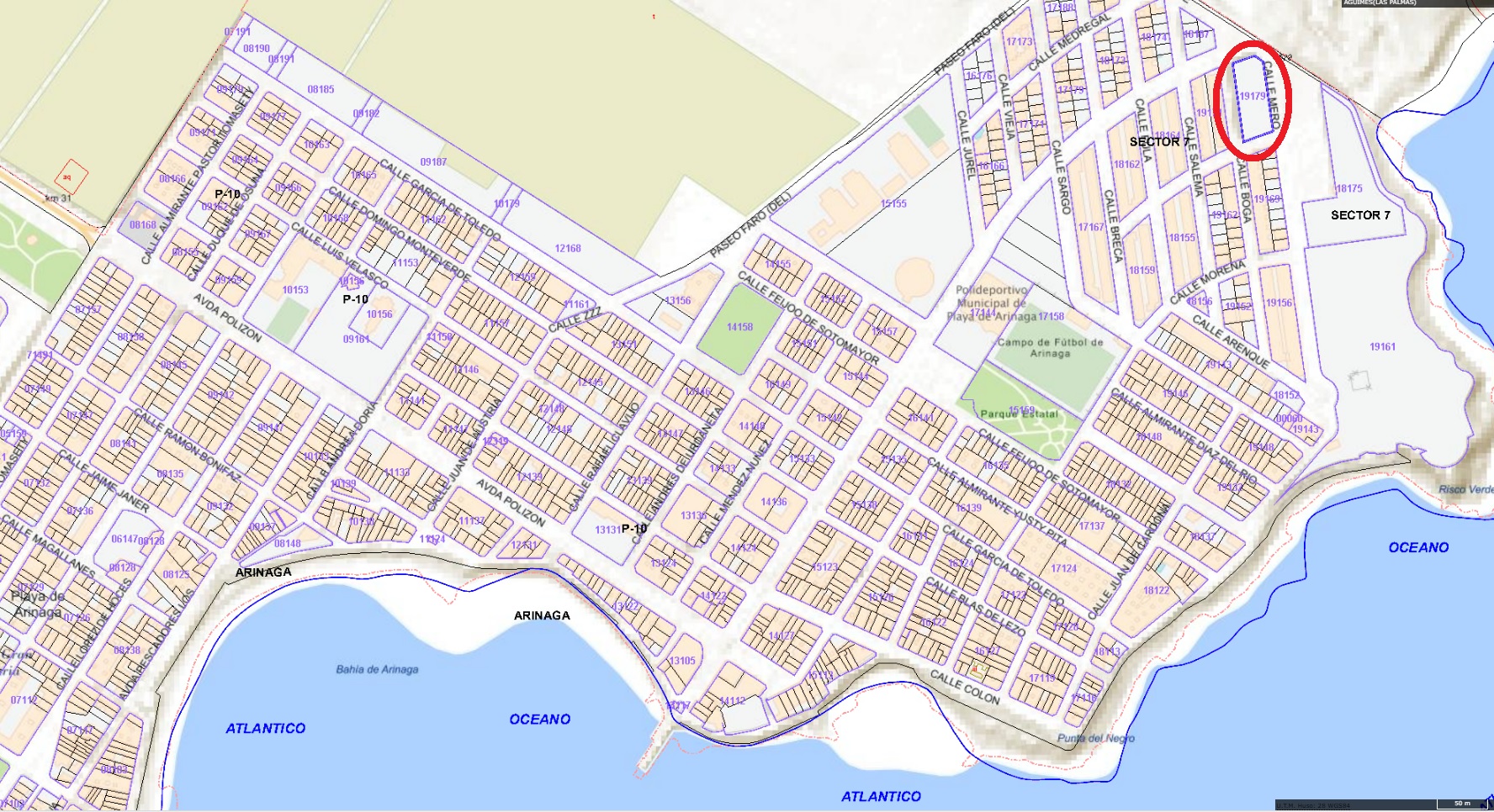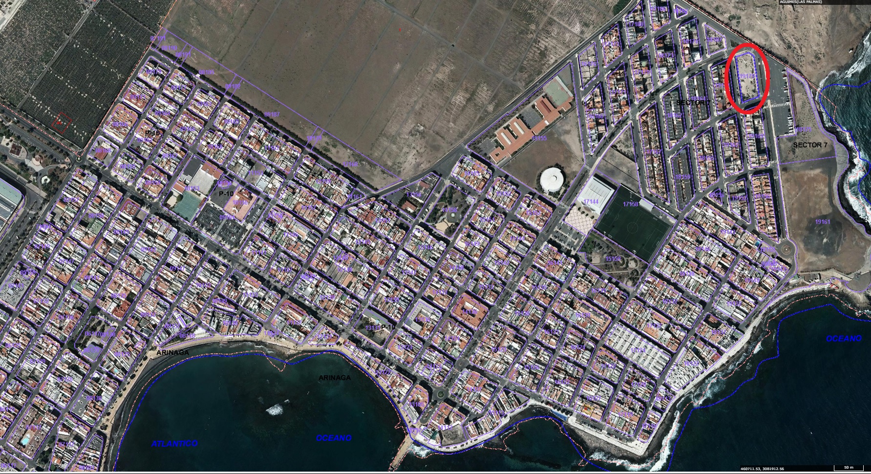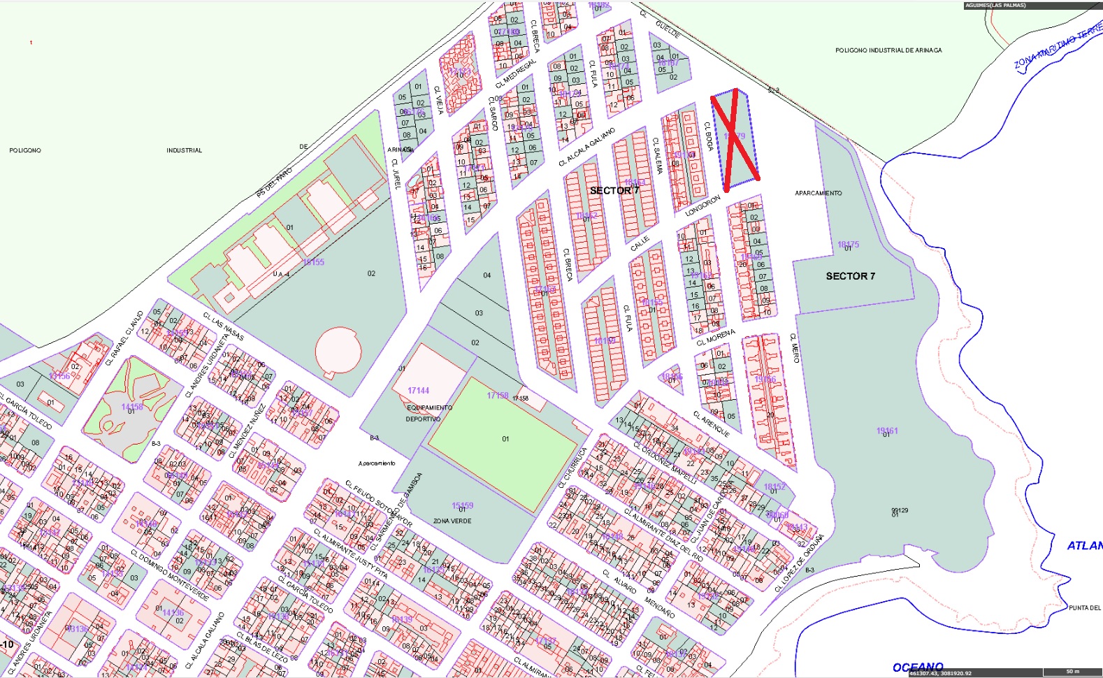 La entidad CONARINAGA S.L. es propietario de la finca 30.391 de Agúimes, URBANA.- PARCELA SEÑALADA como letra C, en el Sector 7 de la Playa de Arinaga, en el término municipal de Agüimes. Mide dos mil doscientos noventa y dos metros cuadrados. LINDA.- Al Norte, con la calle Alcalá Galiano al Sur, con calle Longorón, al Este con la calle Mero y al Oeste, con la calle Boga.