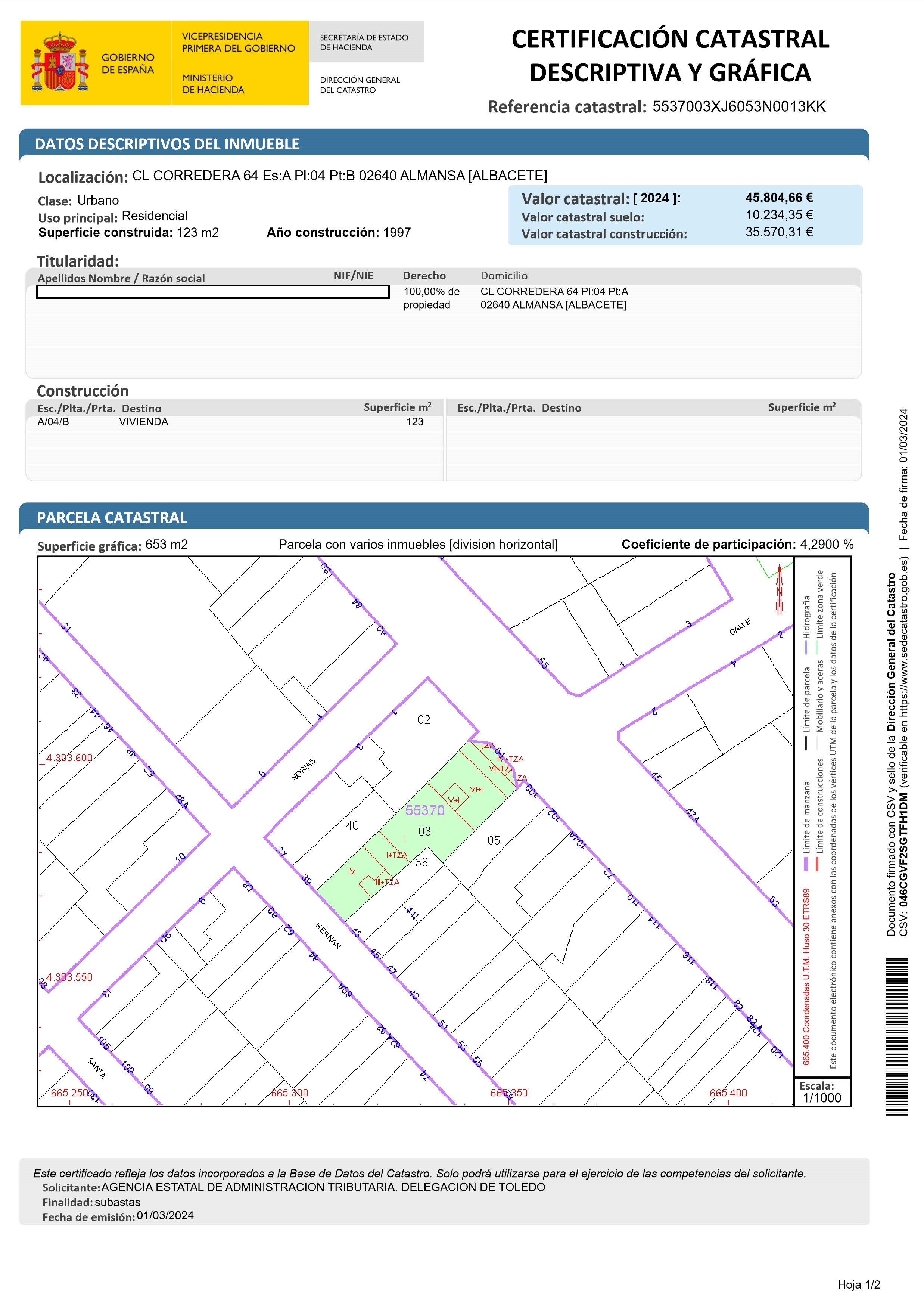 Este bien se encuentra en la siguiente dirección: CL CORREDERA 64 A 04 B, 02640, ALMANSA, Albacete