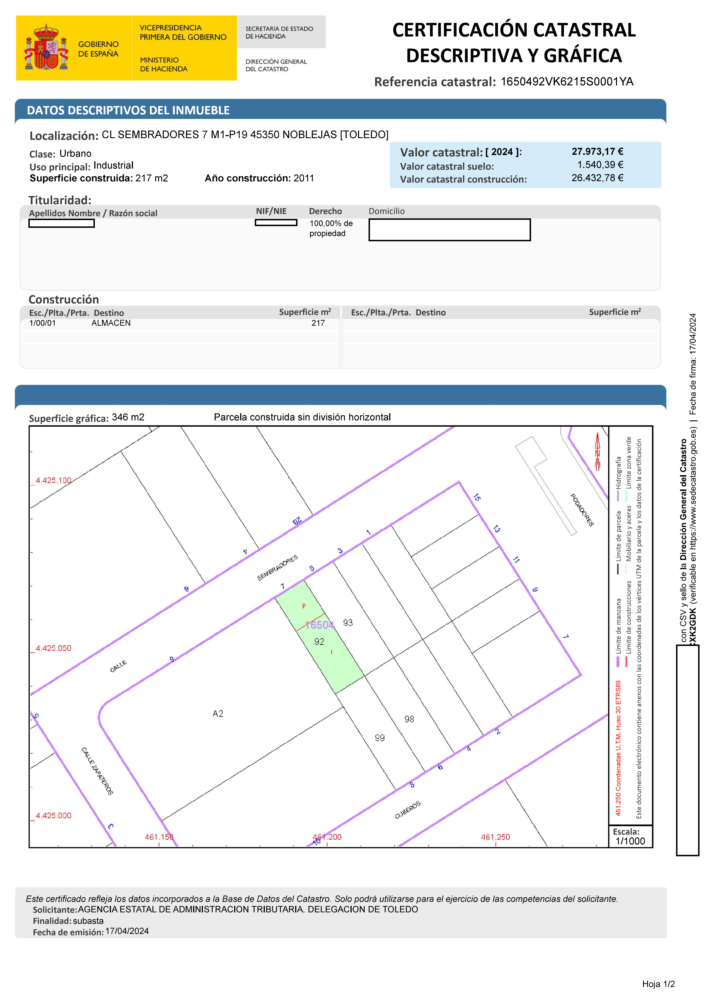 Este bien se encuentra en la siguiente dirección: CL SEMBRADORES 7, 45350, NOBLEJAS, Toledo