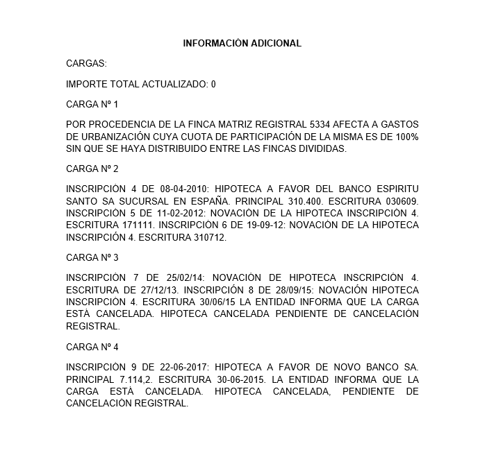 POR PROCEDENCIA DE LA FINCA MATRIZ REGISTRAL 5334 ESTÁ AFECTA A GASTOS DE URBANIZACIÓN CUYA CUOTA DE PARTICIPACIÓN DE LA MISMA ES DE 100% SIN QUE SE HAYA DISTRIBUIDO ENTRE LAS FINCAS DIVIDIDAS. CARGAS QUE AFECTAN AL BIEN: EXISTE MÁS INFORMACIÓN EN IMÁGENES-ANEXO.