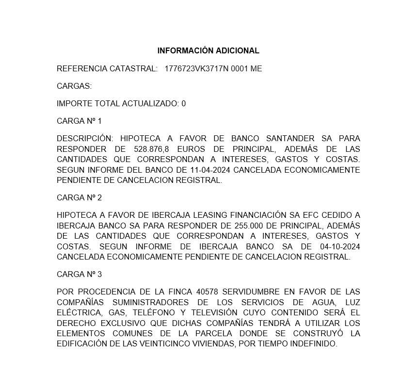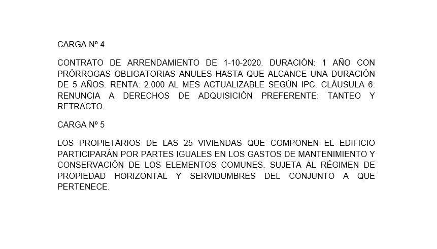 Se ejecuta la Letra B de 19-02-2024 Cargas: Ver información adicional en imágenes anexos y en nota simple POR PROCEDENCIA servidumbre HIPOTECA INSCRIP 2ª modif por inscrip 3, a favor de BANCO SANTANDER CENTRAL HISPANO SA Cancelado eco. Pendiente de cancelación registral. HIPOTECA INSCRIP 4ª, a favor de IBERCAJA LEASING FINANCIACION SA EFC. Cancelada eco. Pendiente de cancelación registral. Arrendamiento de 1-10-2020. Duración: 1 año con prórrogas obligatorias anules hasta que alcance una duración de 5 años. Renta: 2.000 al mes actualizable según IPC. Renuncia a dcho de adquisición preferente: tanteo y retracto. Duración, resulta aplicable el artículo 9.1 de la Ley 29/1994 de 24 de noviembre que establece que cuando el arrendador sea una persona jurídica si la duración pactada fuera inferior a 7 años, este se prorrogará obligatoriamente por plazos anuales hasta que el arrendamiento alcance una duración mínima de 7 años.