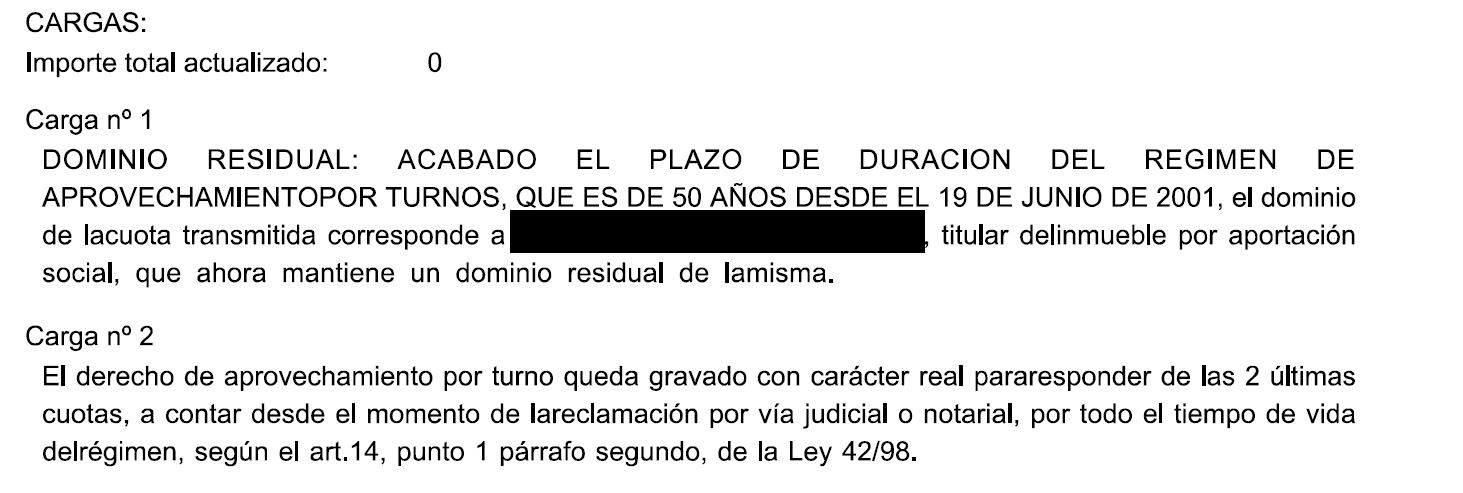 Cargas: ver información adicional en imágenes-anexos. & 8226 DOMINIO RESIDUAL: ACABADO EL PLAZO DE DURACION DEL REGIMEN DE APROVECHAMIENTO POR TURNOS, QUE ES DE 50 AÑOS DESDE EL 19 DE JUNIO DE 2001, el dominio de la cuota transmitida corresponde a ALVARI MULTISERVICIOS, S.L., titular del inmueble por aportación social, que ahora mantiene un dominio residual de la misma. & 8226 El derecho de aprovechamiento por turno queda gravado con carácter real para responder de las 2 últimas cuotas, a contar desde el momento de la reclamación por vía judicial o notarial, por todo el tiempo de vida del régimen, según el art.14, punto 1 párrafo segundo, de la Ley 42/98. Se ejecuta la diligencia 282423560127K . Anotación letra A.
