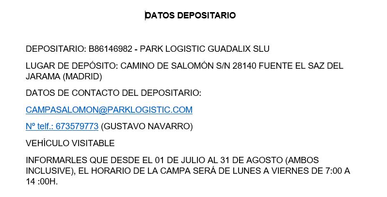 VEHÍCULO VISITABLE. Lugar de depósito: PARK LOGISTIC GUADALIX SLU en: C/CAMINO DE SALOMÓN S/N 28140 FUENTE EL SAZ DEL JARAMA). Datos de contacto depositario: ver imágenes & 8211 anexos