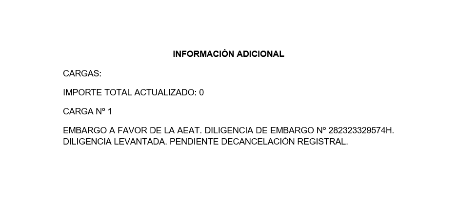 Cargas: Embargo a favor de la AEAT. Diligencia de embargo nº 282323329574H. Levantada 30-10-2024. Pendiente de cancelación registral. CARGAS QUE AFECTAN AL BIEN: EXISTE MÁS INFORMACIÓN EN IMÁGENES & 8211 ANEXO.