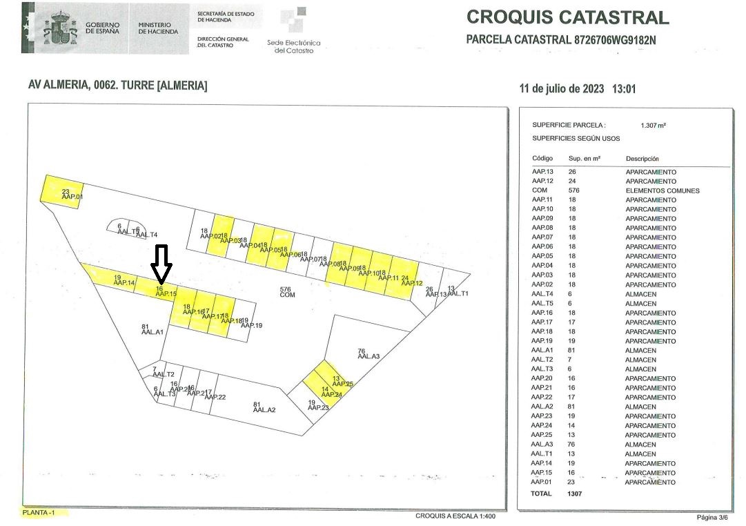 100% PLENO DOMINIO.URBANA: CUARENTA Y SEIS.- DE UN EDIFICIO DE CINCO PLANTAS O NIVELES DENOMINADO LOS ÁNGELES , SOBRE UN SOLAR SITUADO EN LA AVENIDA DE ALMERÍA, TÉRMINO DE TURRE, PLAZA DE APARCAMIENTO, EN PLANTA DE SÓTANO 1-, DESIGNADA CON EL NÚMERO CUARENTA Y SEIS, A EFECTOS DE LA LEY DE PROPIEDAD HORIZONTAL, Y GRAFIADA CON EL NÚMERO 15. TIENE UNA SUPERFICIE DE QUINCE METROS, CON CUARENTA Y OCHO DECÍMETROS CUADRADOS. LINDA, CONSIDERANDO EL FRENTE LA ZONA DE ACCESO Y MANIOBRA, DERECHA ENTRANDO, PLAZA DE APARCAMIENTO NÚMERO 14 IZQUIERDA, PLAZA DE APARCAMIENTO NÚMERO 16 Y FONDO, ALMACÉN DEL LOCAL 1.