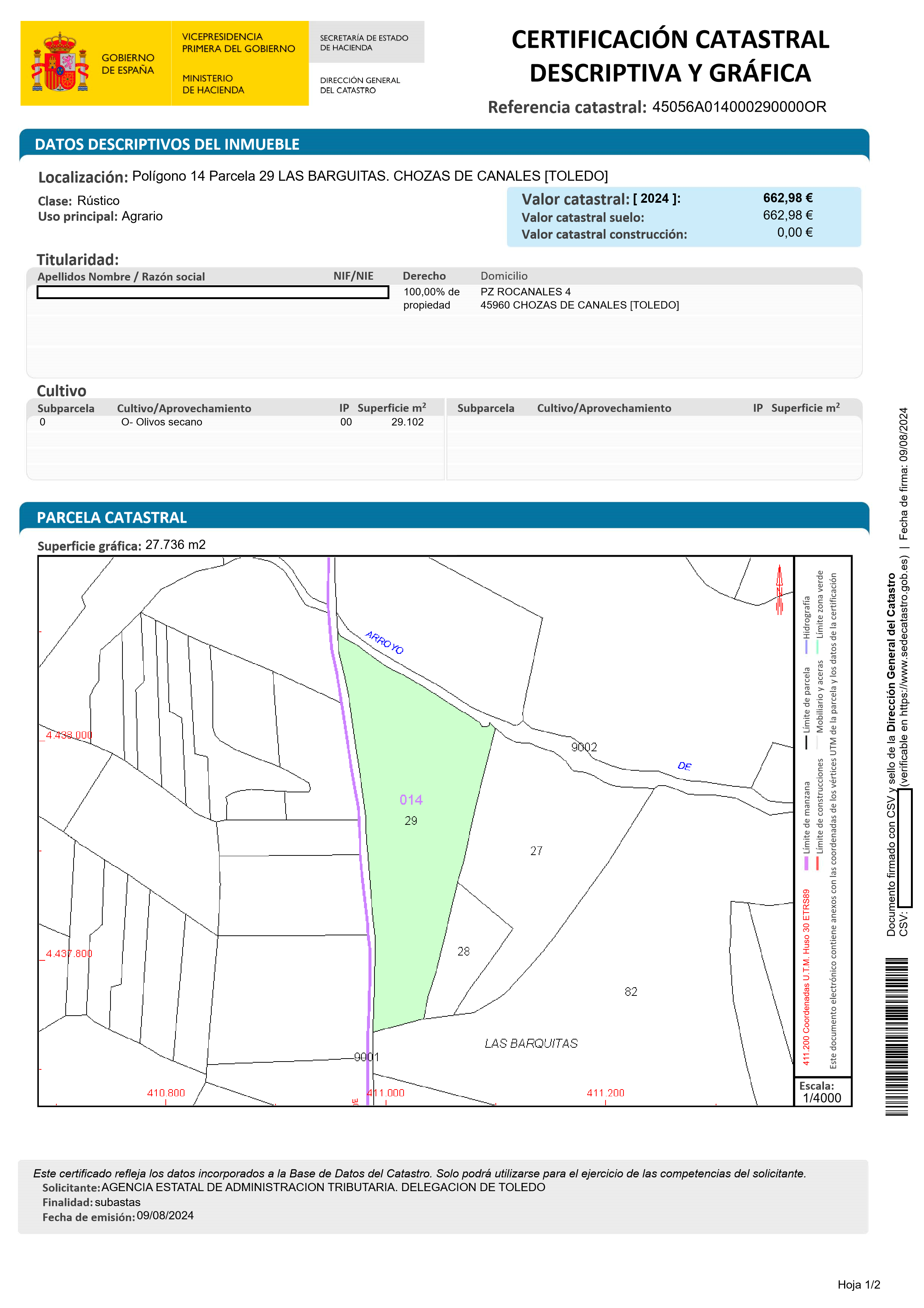 Este bien se encuentra en la siguiente dirección: PJ BARGUITAS 0, 45960, CHOZAS DE CANALES, Toledo