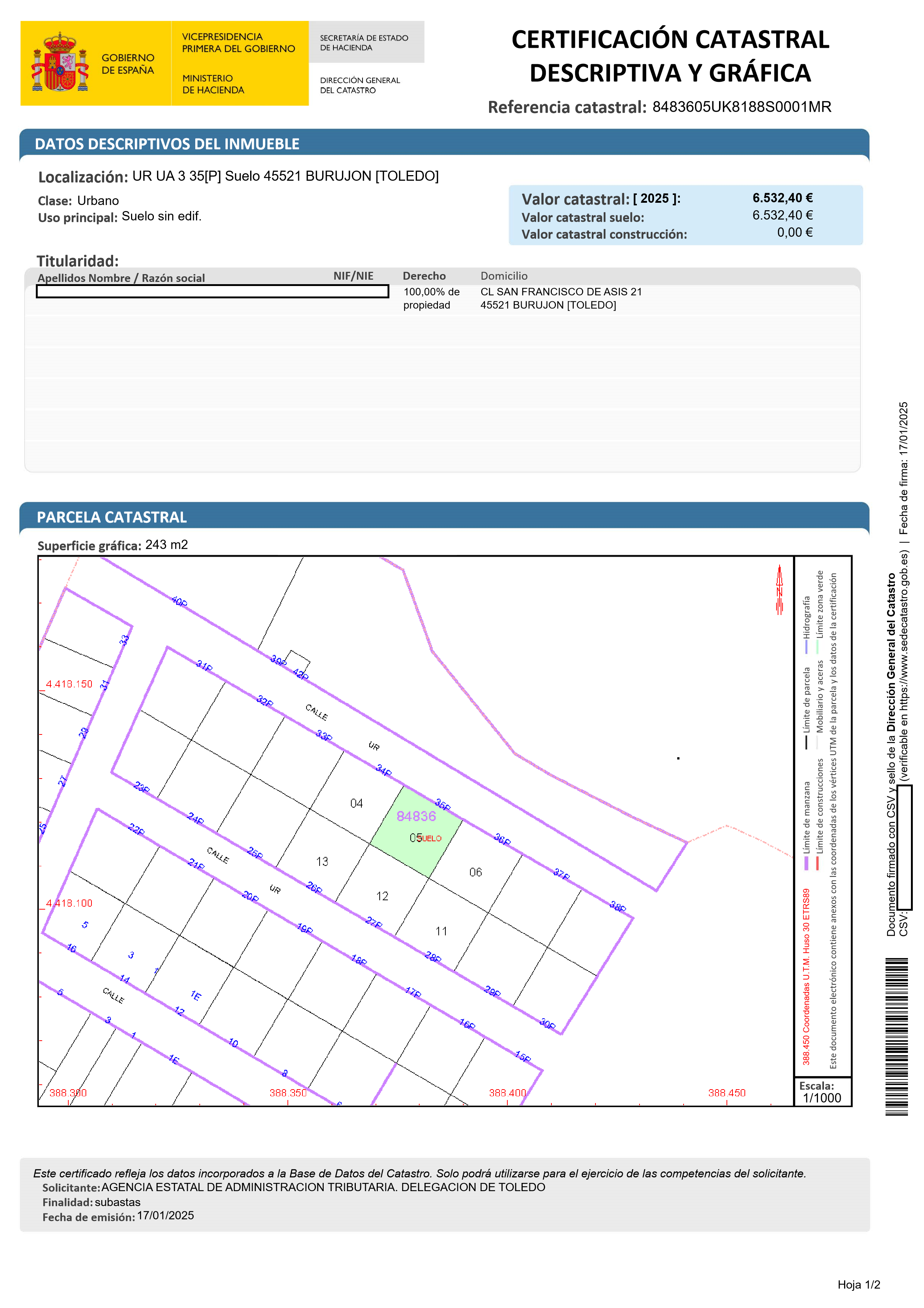 Este bien se encuentra en la siguiente dirección: CL NUEVA APERTURA 0, 45521, BURUJON, Toledo