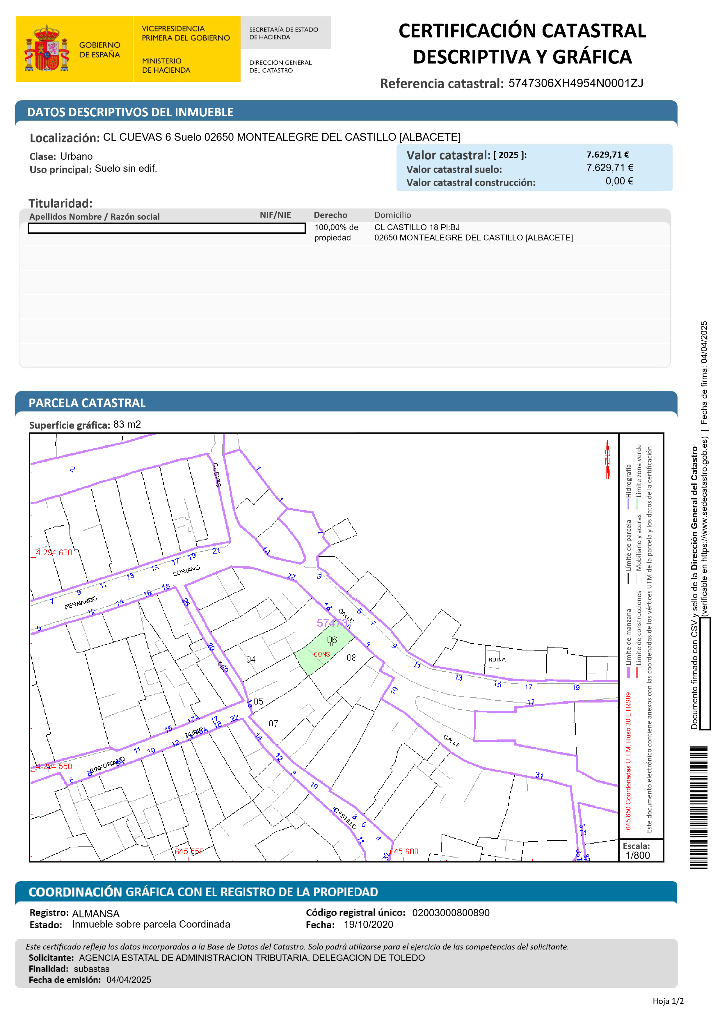 SOLAR SITUADO EN MONTEALEGRE DEL CASTILLO (ALBACETE), CALLE CUEVAS, NÚMERO 6. MIDE OCHENTA Y TRES METROS CUADRADOS, FINCA REGISTRAL 8819.