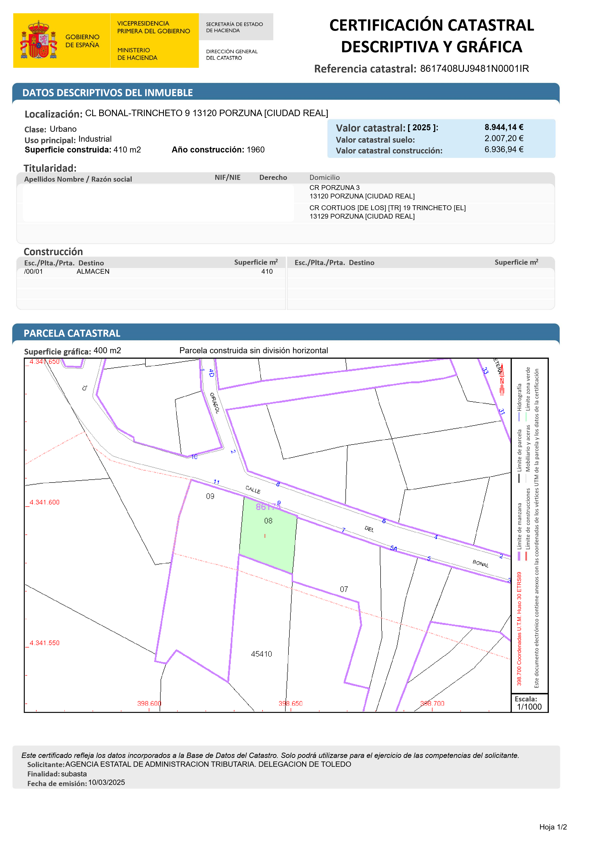 Este bien se encuentra en la siguiente dirección: CL BONAL-TRINCHETO 9, 13120, PORZUNA, Ciudad Real