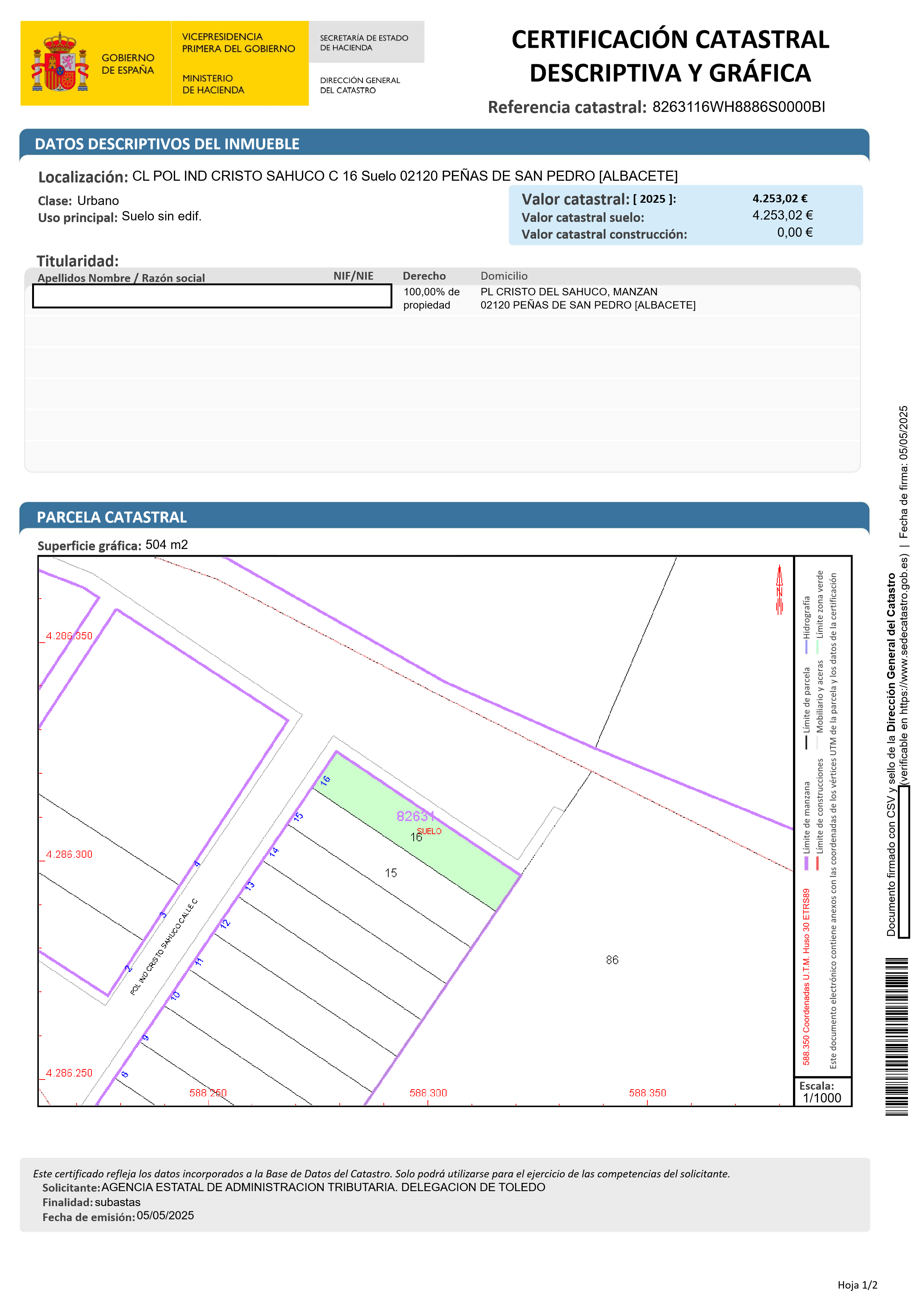 URBANA-TERRENO SOLAR DESTINADO A USO INDUSTRIAL, SITO EN LA DENOMINADA MANZANA 2, DE LA REPARCELACIÓN EFECTUADA EN LA FASE 1 DEL POLÍGONO INDUSTRIAL CRISTO DEL SAHÚCO EN PEÑAS DE SAN PEDRO. TIENE UNA SUPERFICIE DE QUINIENTOS CINCO METROS CUADRADOS -505'00 M2-. LINDA, MIRANDO DESDE LA CALLE C AL FRENTE, DICHA CALLE, DERECHA ENTRANDO, PARCELA DE USO INDUSTRIAL NÚMERO QUINCE, IZQUIERDA, ZONA VERDE DENOMINADA SL ZV-AJ Y APARCAMIENTOS Y FONDO, PARCELA DE USO INDUSTRIAL NÚMERO VEINTIDÓS QUE FORMARÁ PARTE DE LA FASE 2DEL POLÍGONO INDUSTRIAL CRISTO DEL SAHÚCO.
