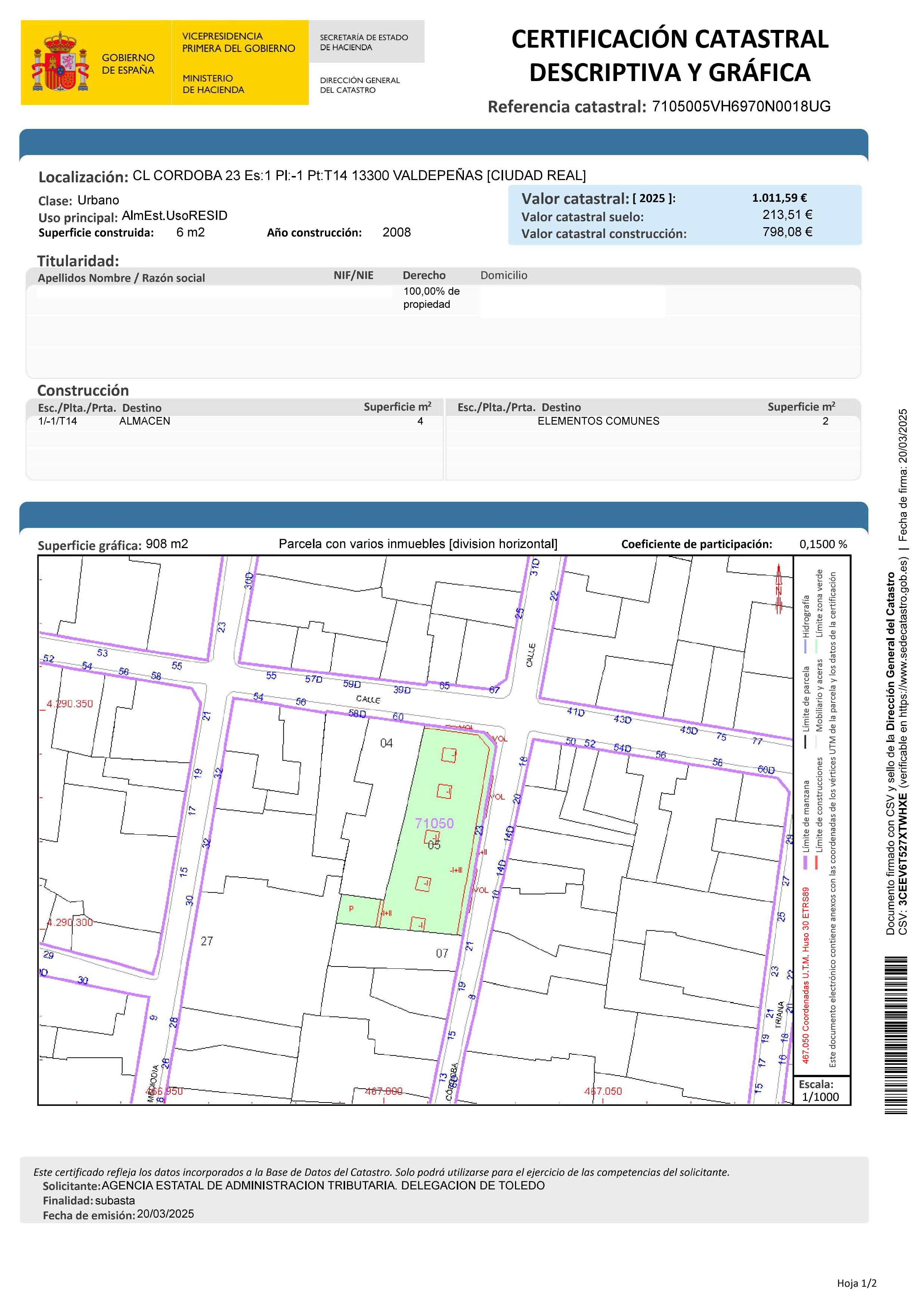 Este bien se encuentra en la siguiente dirección: CL CORDOBA 23, 13300, VALDEPEÑAS, Ciudad Real