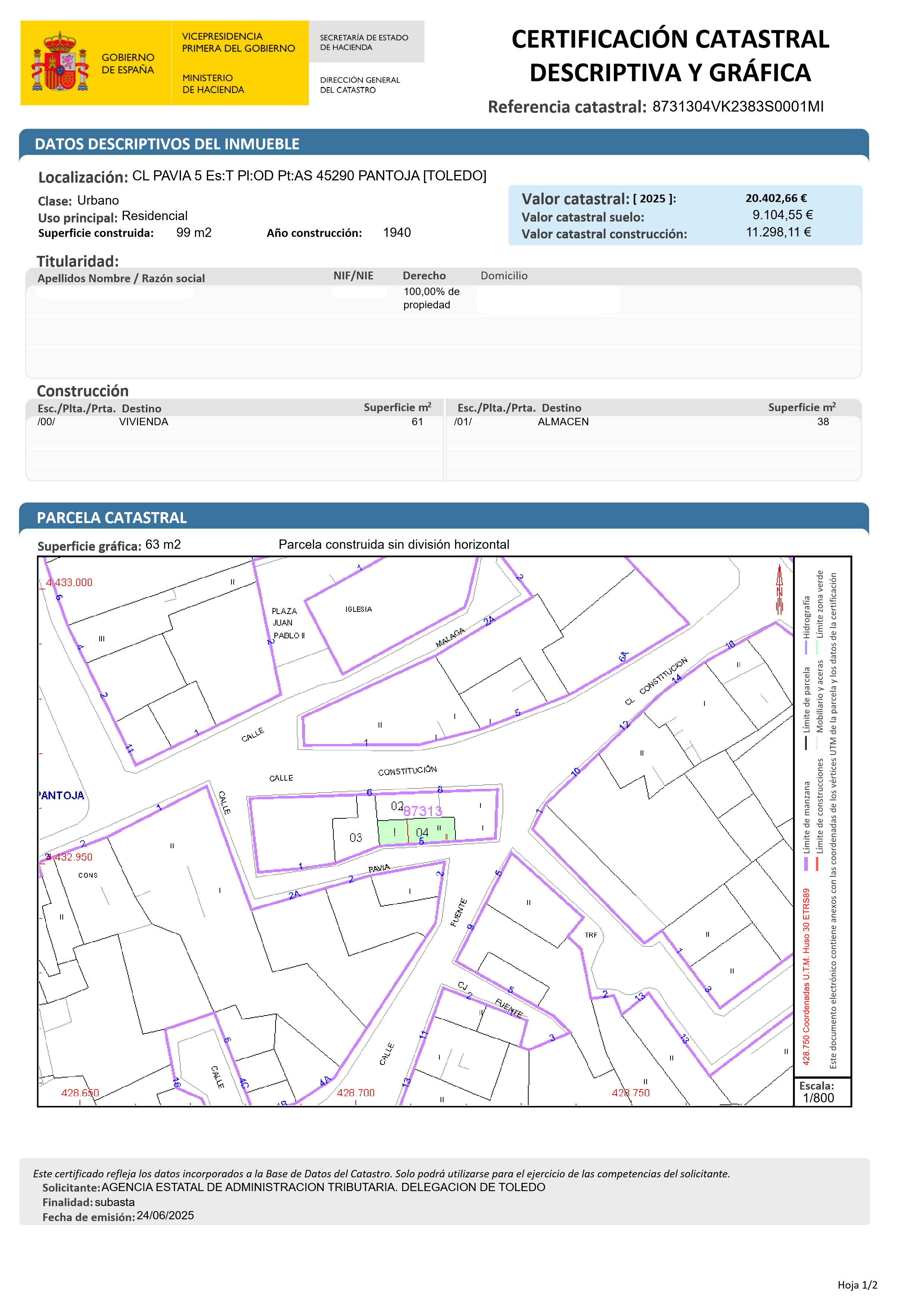 Este bien se encuentra en la siguiente dirección: CL PAVIA 5, 45290, PANTOJA, Toledo