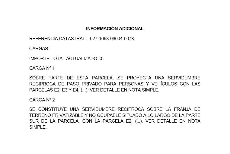 Se ejecuta la diligencia 282423350198J, anotación letra C de 18-02-2025 Cargas: Cargas: 2 servidumbres de procedencia. & 8226 Servidumbre de paso privado para personas y vehículos & 8226 Servidumbre el acceso a la planta de sótano y plantas altas de las edificaciones que se construyan Para más información sobre las cargas, ver nota simple.