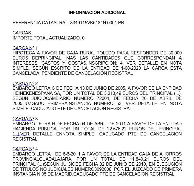 DILIGENCIA DE EMBARGO EJECUTADA 282323531021P DE 08-06-2023, ANOTADO POR LETRA K DE 05-10-2023 Cargas que afectan al bien: existe más información en imágenes-anexo. Existen cargas pendientes de cancelación formal en el Registro de la Propiedad, cuyos gastos de cancelación serán a cargo del adjudicatario.