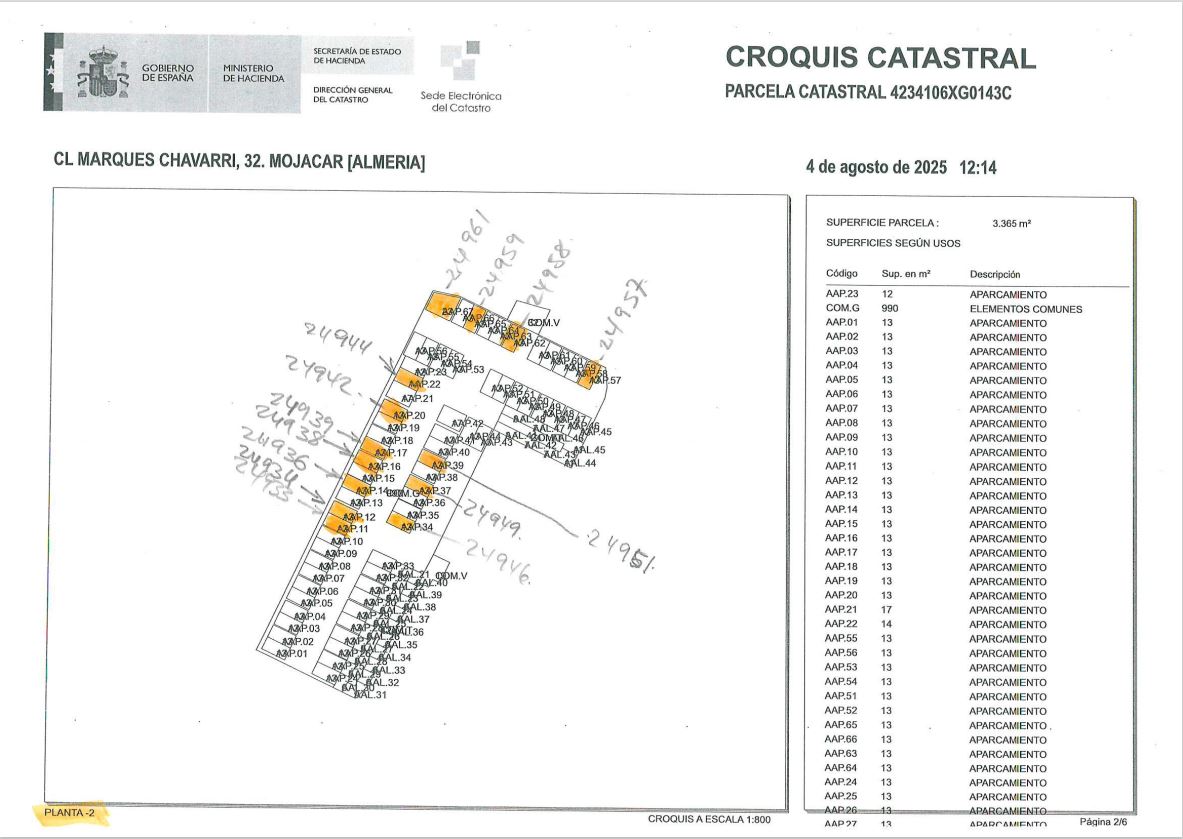 URBANA: Nº 76. PLAZA DE GARAJE UBICADA EN LA PLANTA DE SÓTANO 2 DEL EDIFICIO DENOMINADO GOLF PALACE SITO EN EL TÉRMINO MUNICIPAL DE MOJÁCAR, URBANIZACIÓN MARINA DE LA TORRE, MARCADA CON EL Nº 65 A LA QUE SE ACCEDE POR LA RAMPA DE ACCESO DE VEHÍCULOS SITUADA EN EL LINDERO NORTE DE LA FINCA TOTAL Y PEATONALMENTE DESDE LA PLANTA BAJA MEDIANTE CAJA DE ESCALERAS Y ASCENSOR POR MEDIO DE DOS ACCESOS DISTINTOS. TIENE UNA SUPERFICIE ÚTIL DE 13 M2. LINDA. FRENTE, ZONA DE PASO Y MANIOBRA DERECHA ENTRANDO, PLAZA DE GARAJE Nº 64 IZQUIERDA, PLAZA DE GARAJE Nº 66 Y FONDO, CIMENTACIÓN DEL EDIFICIO.
