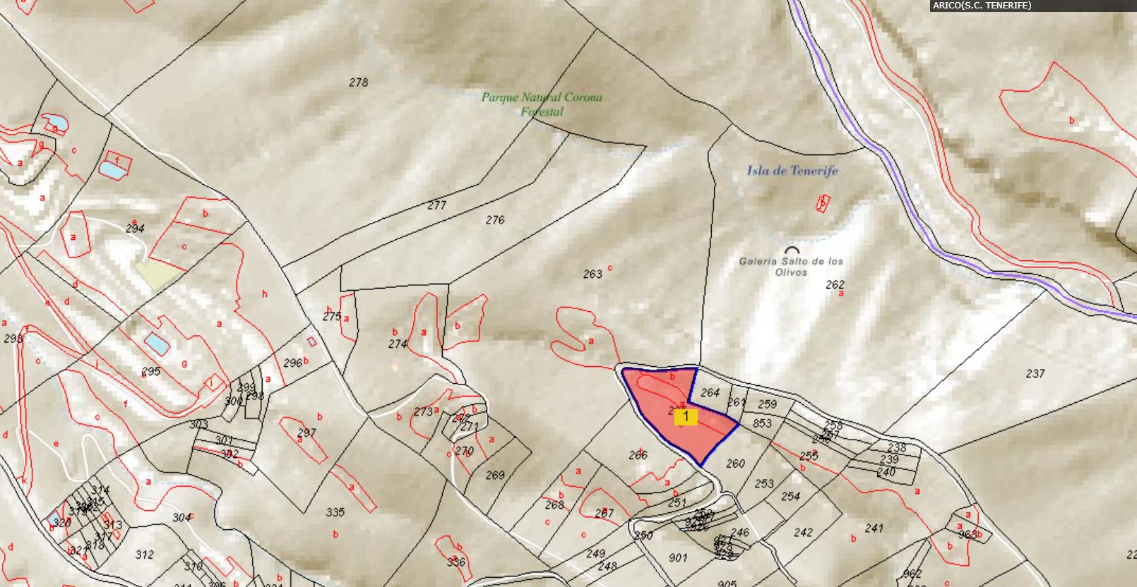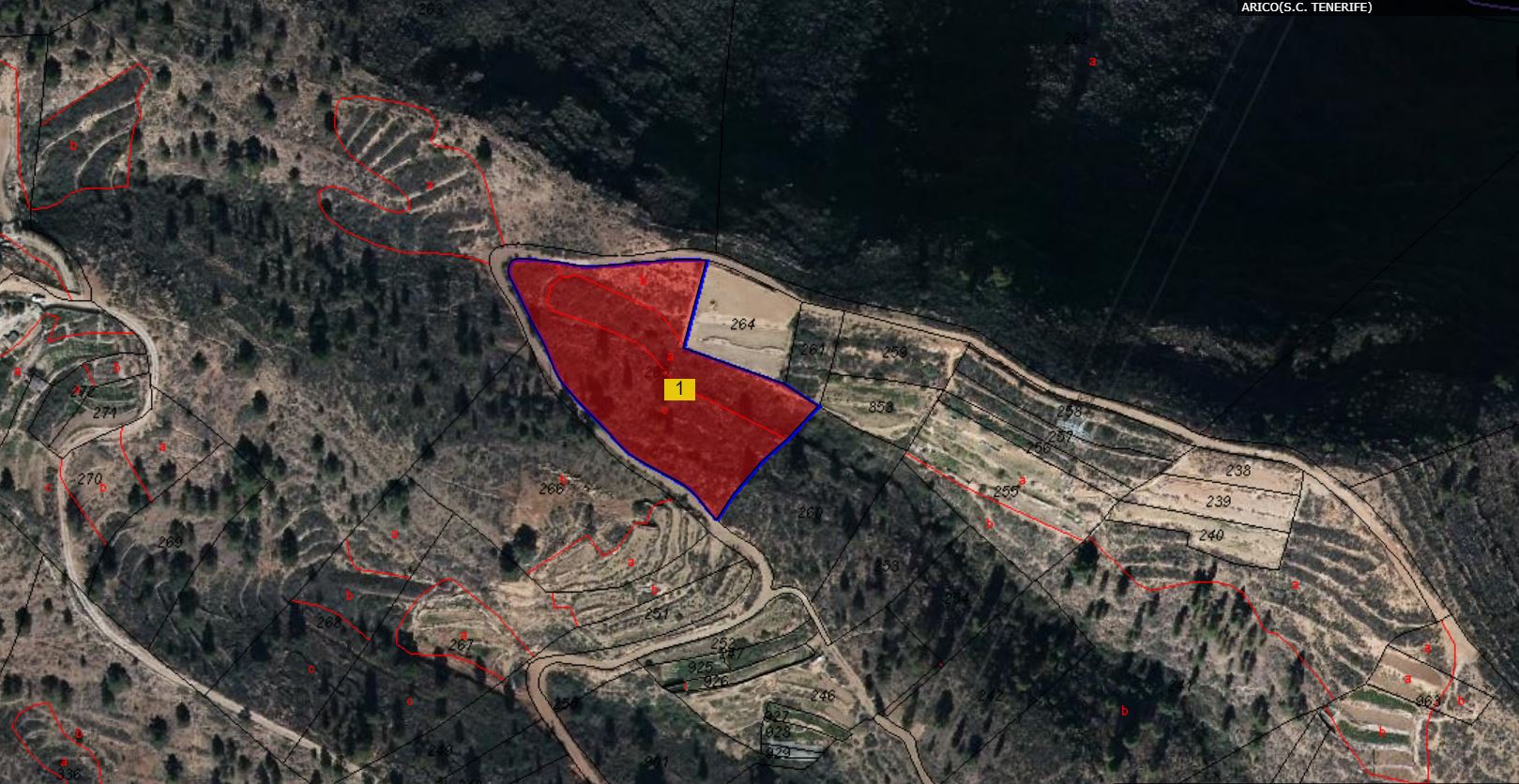 100% PLENO DOMINIO. - RUSTICA.- PARCELA DE TERRENO DISTINGUIDA CON EL NÚMERO 265, DEL POLÍGONO 18, DEL PARAJE CONOCIDO POR LANCITOS , PERTENECIENTE AL TÉRMINO MUNICIPAL DE ARICO.- TIENE UNA SUPERFICIE TOTAL DE CINCO MIL CUATROCIENTOS UN METROS CUADRADOS Y ESTÁ DESTINADO A AGRARIO.- LINDA: NORTE, CON PARCELA 9018, PROPIEDAD DEL AYUNTAMIENTO DE ARICO SUR, CON PARCELA 9018 DEL AYUNTAMIENTO DE ARICO, CON PARCELA 260, PROPIEDAD DE MANUEL GARCÍA GONZÁLEZ ESTE, CON PARCELA 264, PROPIEDAD DE ESTEBAN GONZÁLEZ TORRES, CON PARCELA 853, PROPIEDAD DE MARÍA CARMEN PÉREZ GONZÁLEZ, CON PARCELA 260, PROPIEDAD DE MANUEL GARCÍA GONZÁLEZ Y CON PARCELA 264, PROPIEDAD DE HEREDEROS DE JULIA HERNÁNDEZ RODRÍGUEZ Y OESTE, CON PARCELA