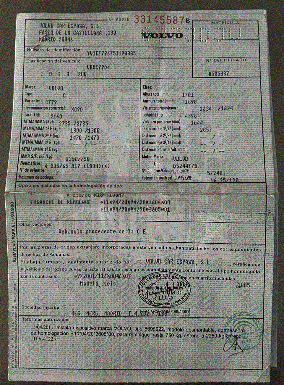 - Bastidor: YV1CT796751198385